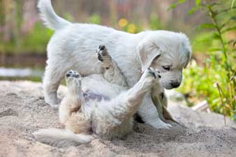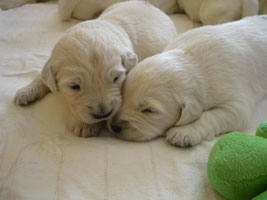 Drei Wochen alt sind nun die Zwerge. Sie laufen schon ganz gut und spielen miteinander. Natürlich sind die Wachphasen nur kurz, aber dann sind sie richtig aktiv. Sie bellen und knurren, beißen sich in die Ohren. Sie klettern schon aufeinander rum. Gestern haben sie mit Flash gespielt, der sie dabei begeistert ableckte. Man könnte den ganzen Tag dabei zu sehen.