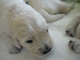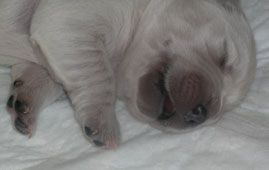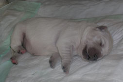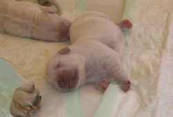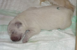 Am Freitag den 25.3.2011 kam um 13.10 Uhr der erste Rüde zur Welt mit dem stolzen Gewicht von 510 g. ohne Markierung. Ca. 20 Minuten Presswehen waren nötig. Nach einer Stunde kam dann Rüde Blau mit 490 g zur Welt. Nach 20 Minuten kam dann die erste Hündin, welche Freude, da es die erste Hündin überhaupt war. Die rotmarkierte Dame wog 410g.