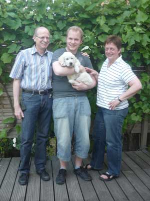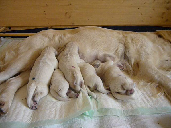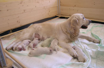 Lina ist Ende Januar von Falco, Zazou of Sweet Gypsie Rose, gedeckt worden. Er ist ein sehr ruhiger und ausgeglichener Rüde, Vater von etlichen Therapiehunden. Er vererbt vorzügliches dunkles Pigment und viel Fell. Seine Gesundheitswerte sind hervorragend. Näheres unter http://www.golden-retriever-stud-dogs.com/html/falco.html