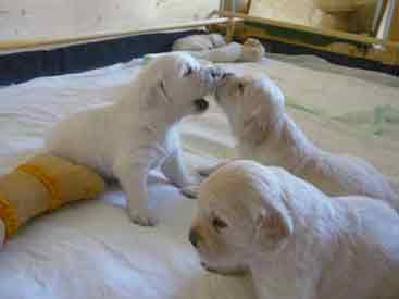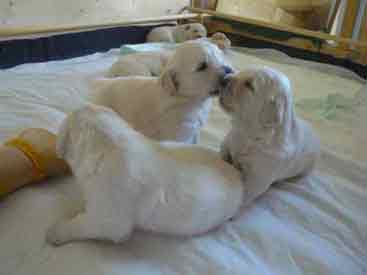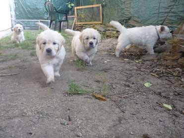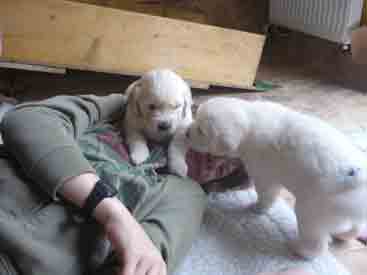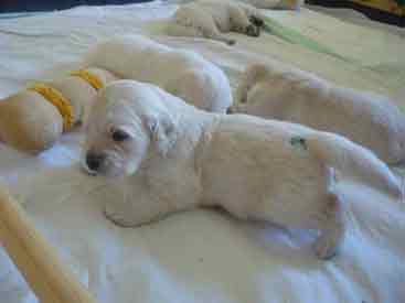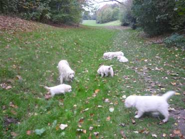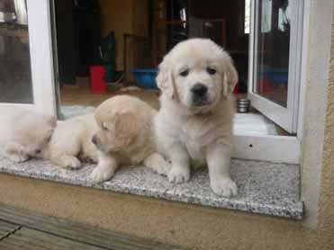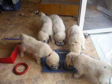 Heute sind die Kleinen 5 Wochen alt. Sie sind nun sehr unternehmungslustig. Sie waren auch schon im Garten und in der Küche unterwegs. Sie kennen wenig Angst. Auch Geräusche wie Klingeln, Rasseln oder Klappern macht sie eher neugierig. Am Wasser waren sei auch schon, Barney hat gleich ein Kopfsprung ausprobiert und ist ordentlich nass geworden, was ihn aber wenig beeindruckt hat. Sie schlafen jetzt schon drei tage wunderbar durch, was ich wirklich wunderbar finde. Insgesamt bellen sie sehr wenig, was am Anfang anders war. Hier die Bilder der 5 mit 5 Wochen: