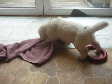 Heute waren sie auch schon an der Tür interessiert und fanden das draußen wohl sehr interessant. Neues Spielzeug wird sofort intensiv untersucht. Nun beginnt auch die Zeit, sie an das Welpentoilette zu gewöhnen. Immer wenn sie wach werden, heißt es genau hinschauen und schnell auf die Unterlage setzen. Wenns klappt, viel loben. Ab und zu hat es schon mal geklappt. Na ja, kann ja auch Zufall sein. Da heißt es jetzt, hartnäckig dranbleiben.