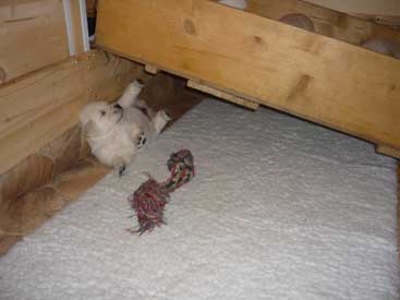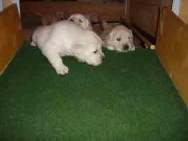 Nun sind die Welpen gut drei Wochen alt. Die ersten Ausflüge aus der Welpenkiste haben sie schon unternommen. Die Rampe ist ihnen noch nicht geheuer, aber der große Raum ist soooo spannend.