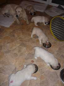 Heute sind die Welpen 4 Woche alt. Die Rasselbande frisst nun aus dem Napf. Gestern war es das erste Mal, und sie haben es ohne Problem gemeistert. Es sah gekonnt aus. Heute Morgen gab es zum ersten Mal den Brei. Das fanden sie richtig klasse.Lina fängt nun an sie zu erziehen, sie werden jetzt auch ganz schön rabiat.. Wenn sie alle satt sind und Lina noch im Gehege ist, dann will der eine oder andere nochmal Nachschlag. Lina hört sich an wie eine Nähmaschine, wenn sie knurrt. Allerdings sind sie nicht leicht zu beeindrucken. Heute hat sie dann zweien ganz klar Bescheid gesagt, so dass sie dann doch verstanden haben, was sie meint. Das ist eine wichtige Erziehungsmaßnahme, und bald brauch Lina nur ein wenig knurren, und sie nehmen es ernst. Wir Menschen werden auch ordentlich beknabbert und auch beklettert. Auch schon mal an den Ärmel ordentlich geschüttelt. Es macht einfach riesig Spaß mit Ihnen zu spielen. Heute waren auch noch Nägelschneiden und die zweite Wurmkur dran. Draußen waren sie heute nur kurz, dazu war es einfach zu nass und zu windig. |