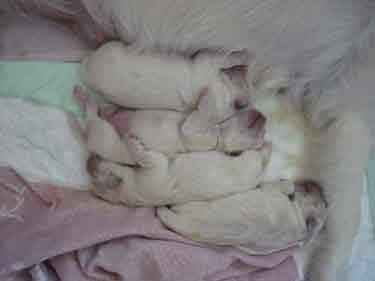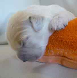 Die Nacht war einigermaßen ruhig. Die kleinen Zwerge haben schon gut zugenommen, zwischen 40 und 60 g. Da es so warm ist, ist es für Lina in der Welpenkiste schon ganz schön heiß und sie hechelt. Sie hat großen Appetit. Sie pflegt die Kleinen so fürsorglich und kann es kaum ertragen, zum Urinieren nach draußen zu gehen. Die kleinen träumen schon viel, und es ist so süß anzu schauen, wie sich die Nase , die Ohren und der Mund immer wieder zuckend zu den Beinchen bewegen,