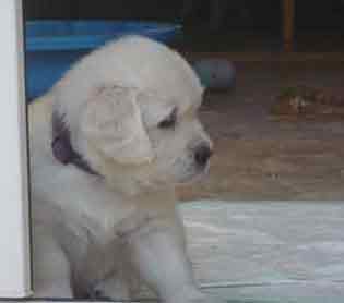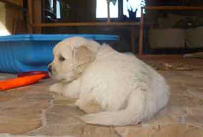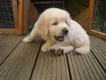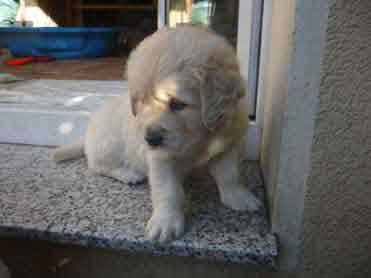Gestern ist viel passiert. Die Welpenkiste wurde abgebaut, nachdem alle Welpen ausgezogen sind, und Cinderella meinte, das sei jetzt das neue Klo, da kann man jetzt die Haufen reinlegen. Da sich der Bewegungsdrang so verändert hat, habe ich auch den großen Außenauslauf freigegeben. Ohne Angst haben sie die Rampe in ihr neues großes Reich überwunden. Als ob sie schon alles kennen würden, freuten die sich über Wiese, Sand, Steinhaufen etc. Seitdem wollen sie immer raus, wenn sie ihr großes Geschäft machen und springen vor die Terrassentür. Das kappt erstaunlich gut, und das mit 4 Wochen. Mit dem Pipimachen klappt es nicht immer so gut. Na ja, wir haben ja noch Zeit. Gestern gab es auch das erste Mal in Welpenmilch eingeweichtes Trockenfutter. Das fanden alle sehr lecker. Heute Nacht haben sie zum ersten Mal durchgeschlafen. Gestern abend gab es das Gehackte spät, dann schliefen sie und schliefen sie, bis uns der Kater weckte, weil er sich nicht an die Ferien von meiner Familie gewöhnt hat, und meinte: Aufstehzeit. Heute hatten sie dann zum ersten Mal ihr Halsband an, und nach kurzer Eingewöhnzeit bzw. Kratzzeit, nahmen sie das gelassen hin. Das Bällebad lernten sie heute auch kennen. Sie sind sehr gelassen im Moment und bellen ganz wenig, das war am Anfang deutlich mehr. Auch die Temperamentunterschiede, die Jungs waren am Anfang die ruhigsten, haben sich angenähert. Alle sind gleich munter und spielen wild miteinander, mal ist der eine oben, mal der andere.