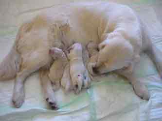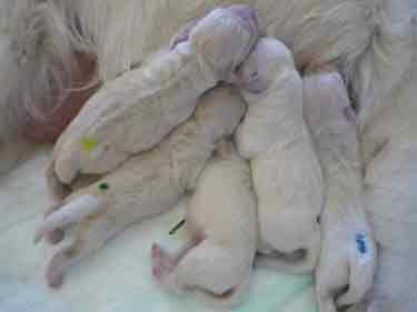 Morgens um 7 Uhr fangen bei Lina die Presswehen an. Der erste Welpe kommt gerade, als mein Mann zu Arbeit weg ist und mein Sohn zur Schule, um 7.56 Uhr. Es ist ein kleines Mädchen . Gewicht 430g, sie kam mit dem Po voran zur Welt und fing sofort an energisch zu saugen. Wir freuten uns sehr. Eine knappe halbe Stunde ist ein weiterer Welpe da, wieder eine Hündin, Gewicht 470g. Eine dritte Hündin kam um 9.42 mit einem Gewicht von 460 g.