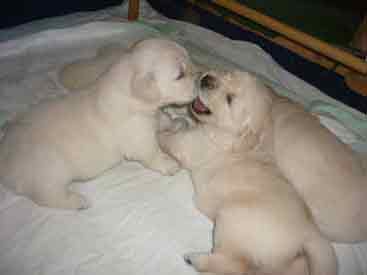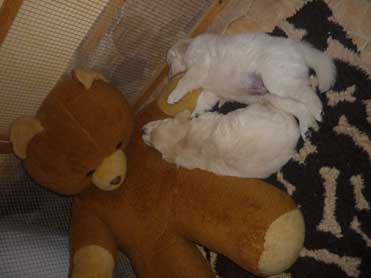 Die Welpen sind nun gute 2 Wochen alt und haben ordentlich an Gewicht zugenommen. Sie wiegen zwischen 1740 und 1830g . Sie werden immer munterer. Sie zeigten heute erste Ansätze von Spielen, bellen sich an, und man kann manchmal schon eine Spielhaltung, Po oben und Kopf unten, erkennen. Sie fangen an, die anderen Welpen und Lina zu beknabbern, und auch wenn man sie auf den Arm nimmt, knabbern sie an Fingern und Pullover. Es ist total lustig, die Zwerge bellen und knurren zu hören. Es hört sich schon ganz energisch an. Sie scheinen sich auch selbst zu hören und antworten den Anderen.