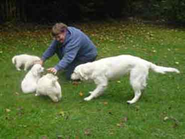Die Welpen sind nun 6 Wochen alt. Viel ist in der letzten Woche passiert. Sie haben enorm an Gewicht zugelegt, einige wiegen nun über 5000g , die anderen sind knapp darunter. Wir hatten einigen Hundebesuch. Lizi mit Frauchen Gabi waren da, Ben aus dem A-Wurf kam mit seiner Großfamilie aus Plettenberg zu Besuch und Anton aus dem B-Wurf kam mit seiner neune Familie zu Besuch. Die Welpen hatten viel Spaß und waren sehr neugierig, die Besuchshunde waren freundlich. Mit Ute , dem Frauchen von Cindy, haben wir die Rasselbande schonmal mit Mama Lina ins Auto gepackt und dann den Motor angelassen, zu Vorbereitung des Ausflugs am Sonntag, wo alle Welpeneltern mit Welpen in den Garten von Sabine fahren.. Sie waren wie kleine Hummeln und Ute hatte Mühe, sie davon abzuhalten, aus dem Auto zu springen. Sitz haben wir schon geübt, und auch das Laufen an der Leine stand schon auf dem Programm. Heute war jeder einzelnen mal mit Mama Lina vorne im Vorgarten an der Leine und haben Autos kennengelernt, die vorbeifuhren. So richtig geheuer war das ihnen aber nicht, sie waren dann froh, wieder ins Haus zu kommen. |
