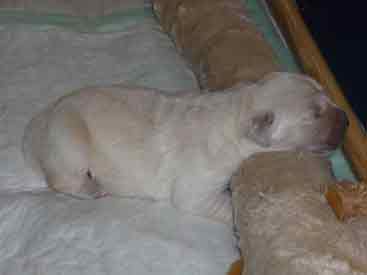 Die Zwerge wachsen sehr gut. Die Rote hat schon fast ihr Geburtsgewicht verdoppelt. Auch die anderen nehmen am Tag zwischen 70 und 100 g zu. Lina hat scheinbar viel Milch. Die Kleinen wandern jetzt nach dem Trinken viel in der Welpenkiste herum. Sie liegen auch gern mal alleine. Wie schon bei den andern Würfen ist die Kuhle hinter der Stange am beliebtesten. Erstaunlicherweise finden sie Lina mittlerweile super schnell, wenn sie dann Hunger haben und können dann auch größere Entfernungen schnell zurücklegen. Eine Mischung aus schieben und krabbeln. Wenn man die Zwerge in die Hand nimmt, winden sie sich wie kleine Schlangen, um ja schnell aus dieser Lage heraus zu kommen.