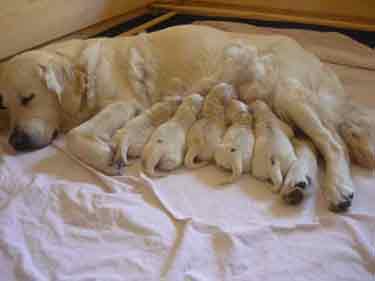 Bei der Temperaturmessung am Morgen zeigte sich, dass Linas Temperatur abgesunken war. Auch ihren Morgenbrei, auf dem sie sich jeden Morgen mit Freude drauf gestürzt hatte, rührte sie nicht an. Heute Mittag hat Lina sich um 12.00 Uhr in die Welpenkiste gesetzt und beschlossen, dass sie sie nicht mehr verlassen wollte. Und das, wo sie die ganze Woche über die Kiste nicht mehr als 2 Mal für eine Minute betreten hatte. Also die Geburt wird wohl bald losgehen. Gegen Abend fängt Lina an zu hecheln. Die Eröffnungsphase beginnt. Wir sind gespannt, wann die eigentliche Geburt losgeht. Bisher hat Lina immer Tagsüber geworfen. Sollte das diesmal anders sein? Gegen 22.15 kommt Mandy von unserem Zuchtverein aus der Nähe von Fulda, die bei der Geburt helfen und lernen will. Da sie selbst hochschwanger ist, bewundere ich ihren Einsatz. Es wird eine unruhige Nacht für uns . Mehr als 1,5 Stunde unruhiges Dösen ist nicht drin. Die arme Lina kann sich irgendwie nicht hinlegen und sitzt die ganze Nacht hechelnd in der Welpenkiste. Jede Stunde will sie in den Garten und rennt die Wege rauf und runter. Ich immer mit der Taschenlampe hinterher, nicht, dass sie einen Welpen im Garten bekommt.